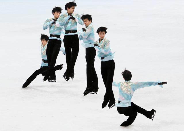 2月10日,日本选手羽生结弦在北京冬奥会花样滑冰男子单人滑自由滑比赛中尝试阿克塞尔四周跳(拼接照片)。新华社记者曹灿摄