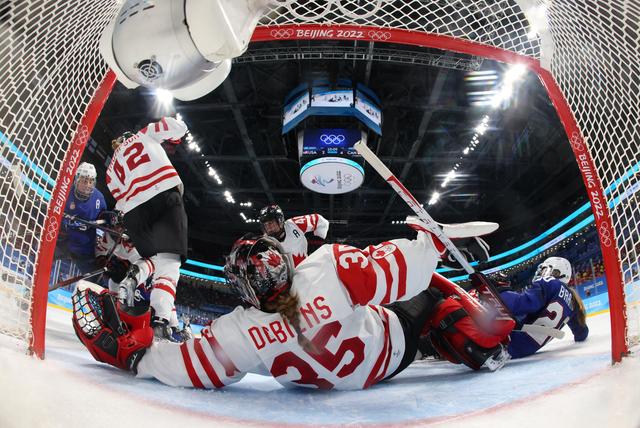2月8日,加拿大队守门员在比赛中封堵对方射门。当日,在五棵松体育中心举行的北京冬奥会女子冰球小组赛中,加拿大队以4比2战胜美国队。新华社记者宋彦桦摄