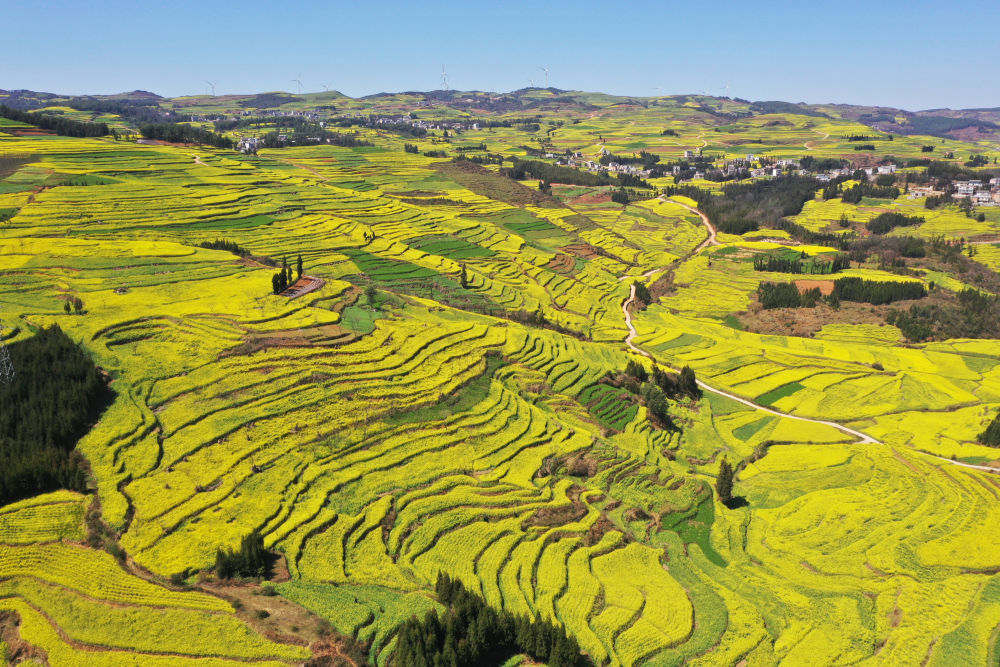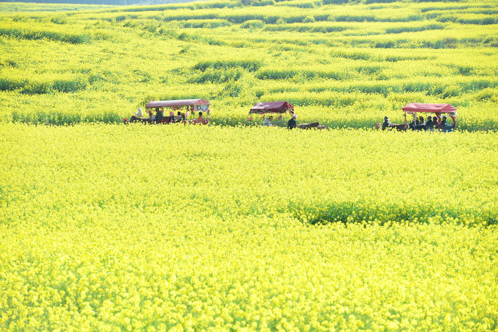 近日,云南省罗平县的100万亩油菜花迎春盛开,黄花、碧水、群山、村舍相映成趣,透出浓浓春意,吸引游客前来赏花游玩。