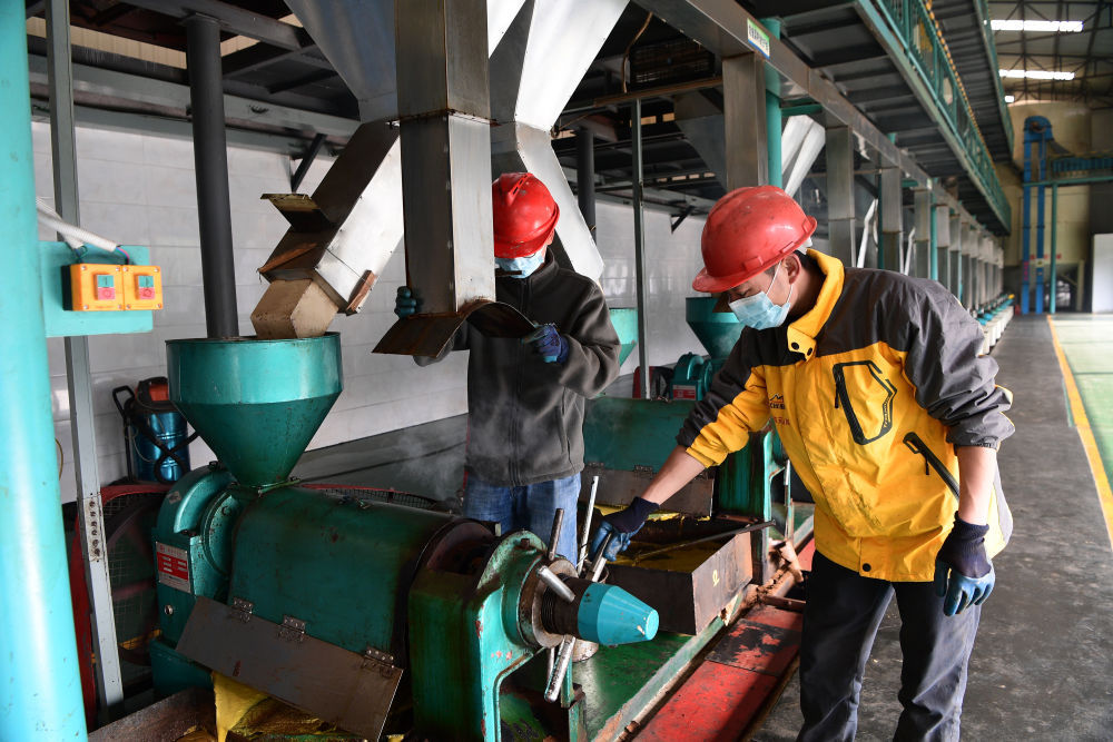 罗平县成天油脂有限公司的菜籽油榨油车间(3月1日摄)。