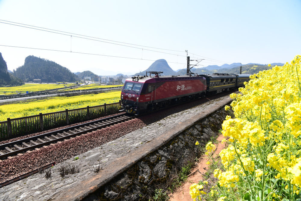 2月28日,列车从油菜花海中穿过,便捷的交通为旅游产业发展提供保障。