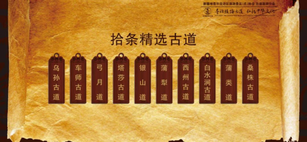 丝绸之路在新疆段全长约2000多公里,留下了丰富多彩的历史古迹、特色文化,沿途分布着壮美的自然风光。这10条丝绸之路古道由新疆旅游景区(点)协会古道旅游分会选出,即乌孙古道、车师古道、弓月道、塔莎古道、银山道、蒲犁道、西州道、白水涧道、蒲类道、桑株古道。