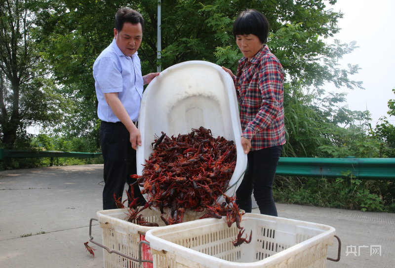 铜陵市义安区东联镇东埂村党总支书记何海龙帮助农户一起将小龙虾装箱称重(央广网发 梅建广摄)