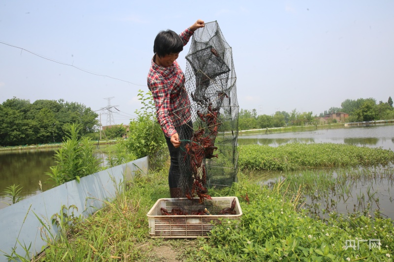 “我们每天早晨都要发货几百斤,四五点就要起来工作,确保把最新鲜的小龙虾送到大家的餐桌上。”陶龙行是合作社的老员工了,伴随着哗哗的水声,她熟练地将沉浸在水中的地笼慢慢提起,再轻抖几下,一只只小龙虾便滚落框中。