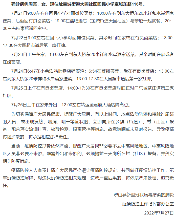 央视新闻客户端消息 据河南信阳罗山县新型冠状病毒感染的肺炎疫情防控工作指挥部办公室消息,2022年7月26日19时—7月27日6时,罗山县在对集中隔离人员核酸检测中发现1例新冠肺炎确诊病例。现将其行程轨迹公告如下: