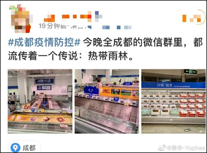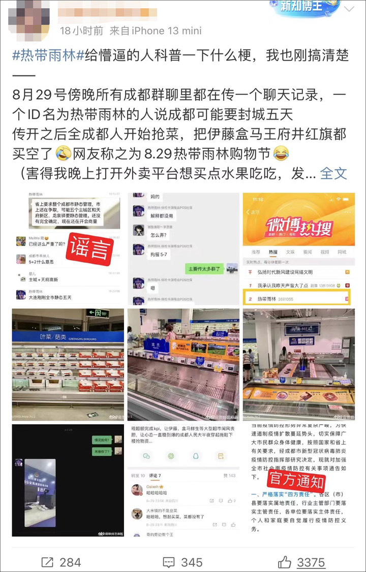 很多网友都不明白其中的意思,有网友科普:8月29号傍晚所有成都群聊里都在传一个聊天记录,一个ID名为“热带雨林”的人说成都可能要封城五天,传开之后全成都人开始抢菜。