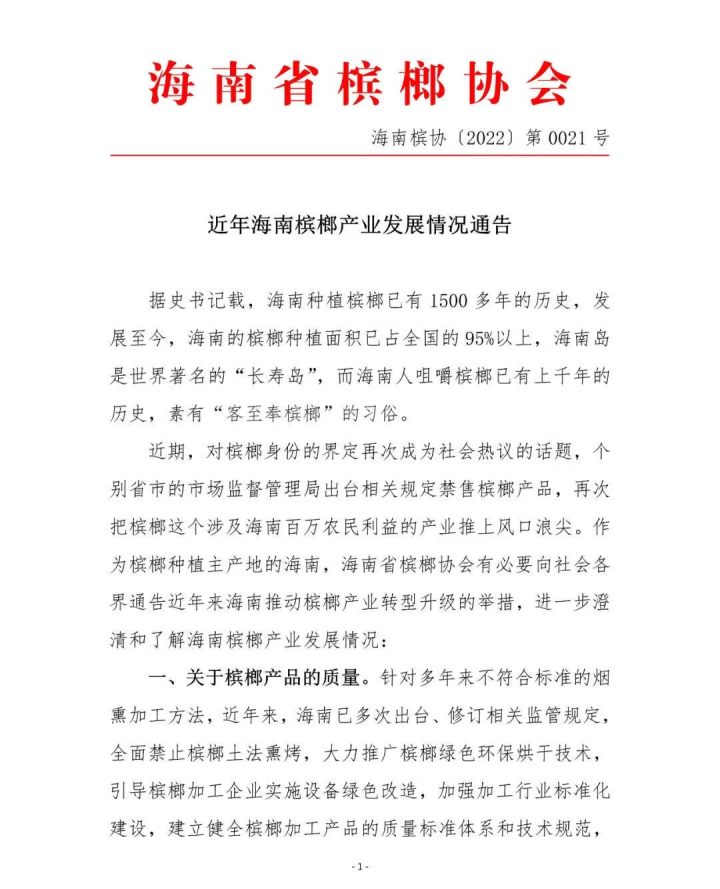 这份通告是9月21日,由海南省槟榔协会发布的。