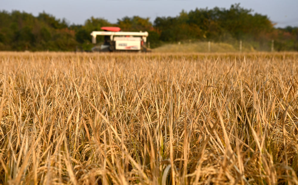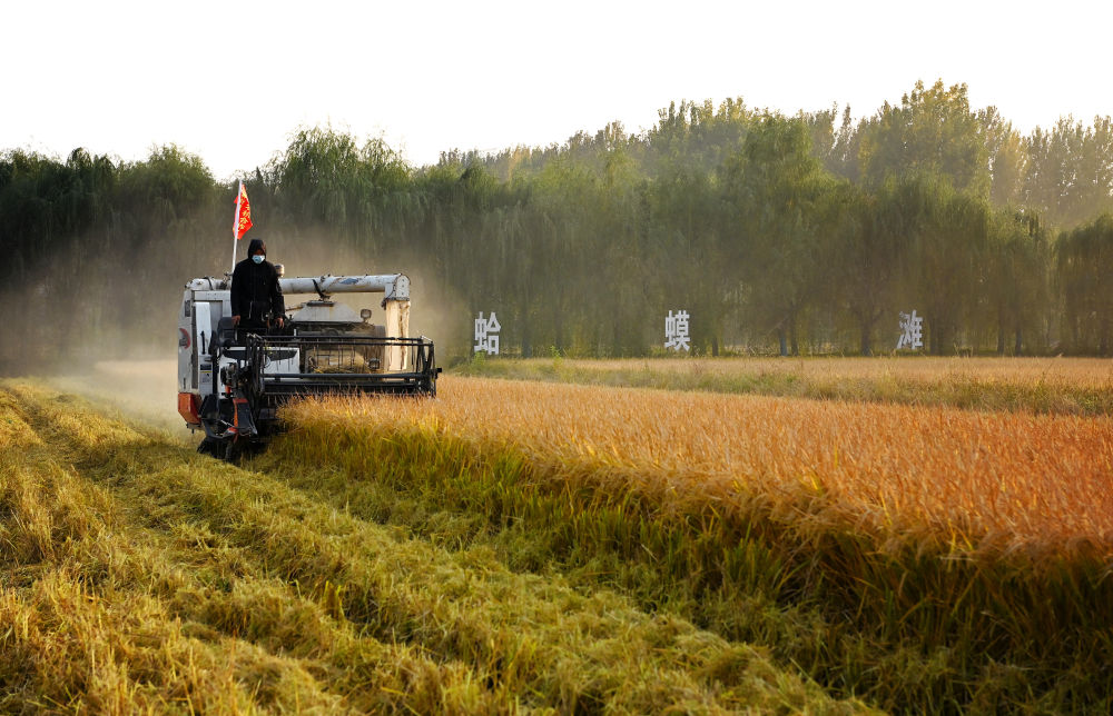 ↑在西安市长安区王曲街道皇甫村,收割机在收割水稻(10月21日摄)。