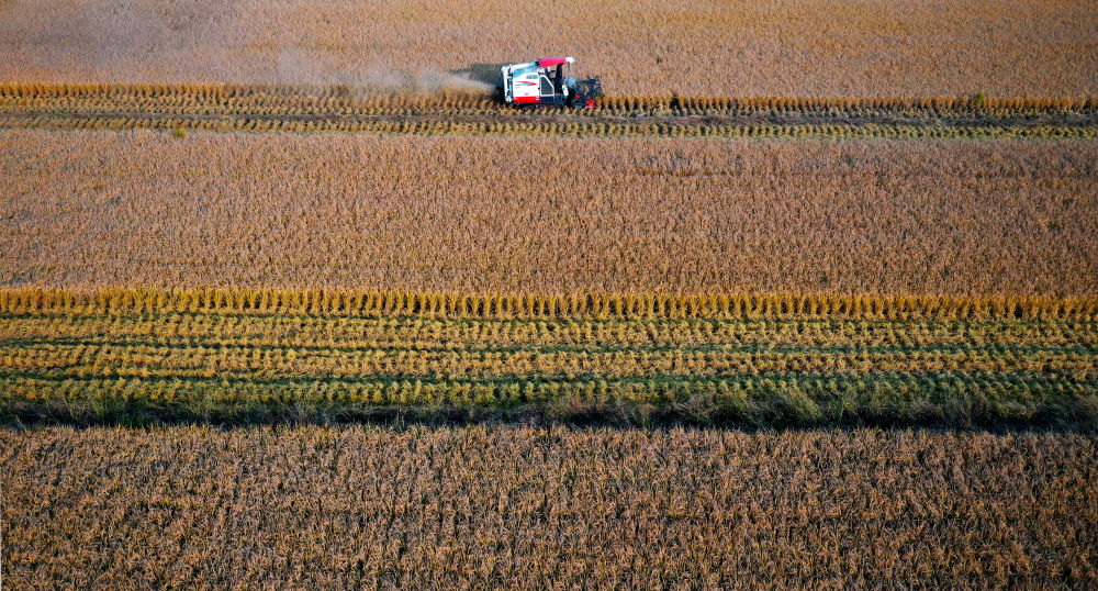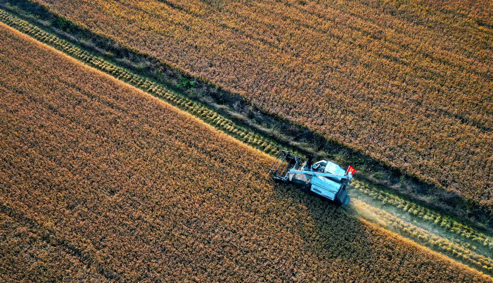 ↑在西安市长安区王曲街道皇甫村,收割机在收割水稻(10月21日摄,无人机照片)。