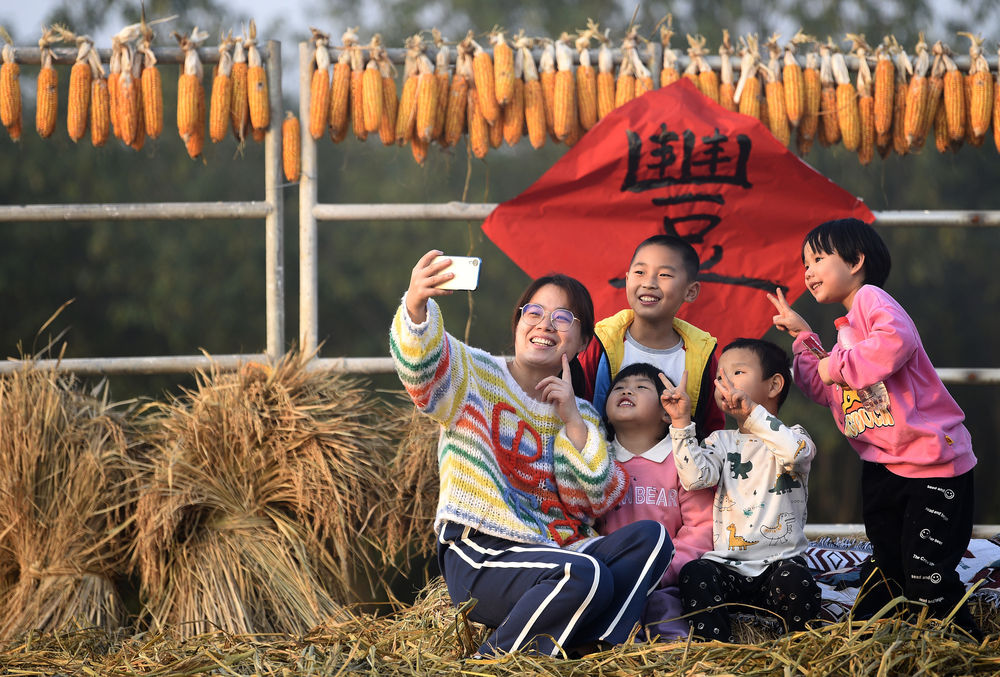 ↑在西安市长安区王曲街道皇甫村,人们在稻田景观上合影(10月21日摄)。