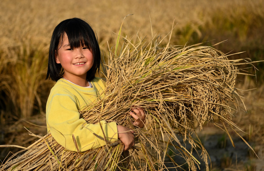 ↑在西安市长安区王曲街道皇甫村,一名儿童在稻田里怀抱稻谷(10月21日摄)。