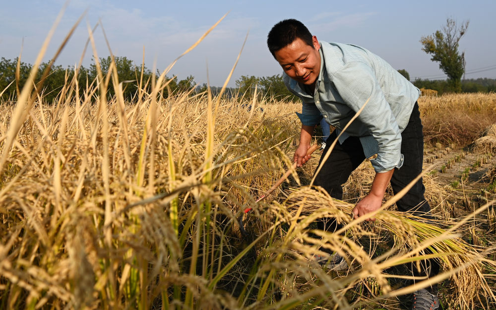 ↑在西安市长安区王曲街道皇甫村,村民在收割水稻(10月21日摄)。