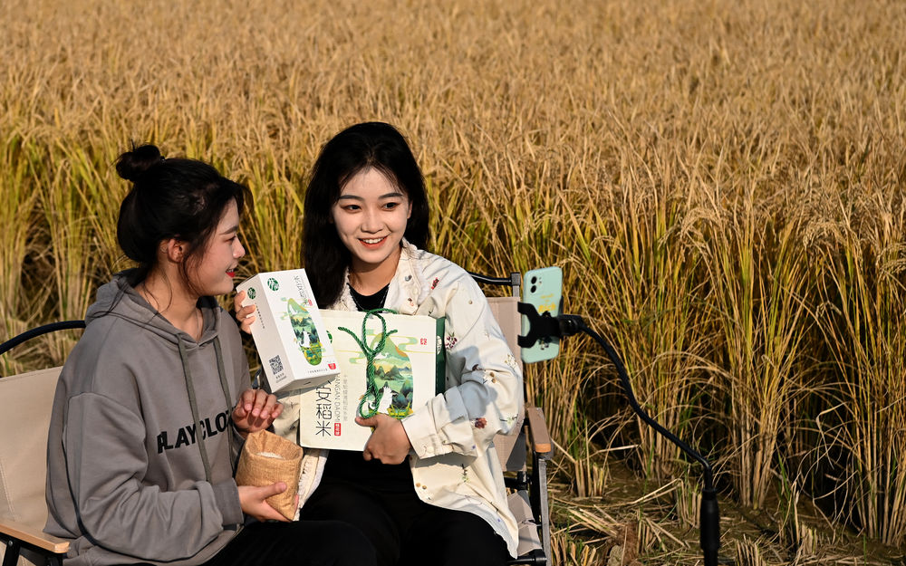 ↑在西安市长安区王曲街道皇甫村,两名主播在稻田边直播销售当地的桂花球大米(10月21日摄)。
