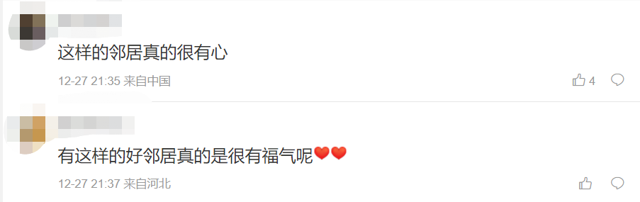 “我们是对门的两位老者,看到你们的小纸条,我们感到十分亲切,心情也很激动……你们主动伸出援助之手,扶老携幼,体现当今社会主流正能量大于一切!感谢你们的问寒问暖,有需要的我们一定向你们张嘴,谢谢啦好邻居!谢谢啦年青人”