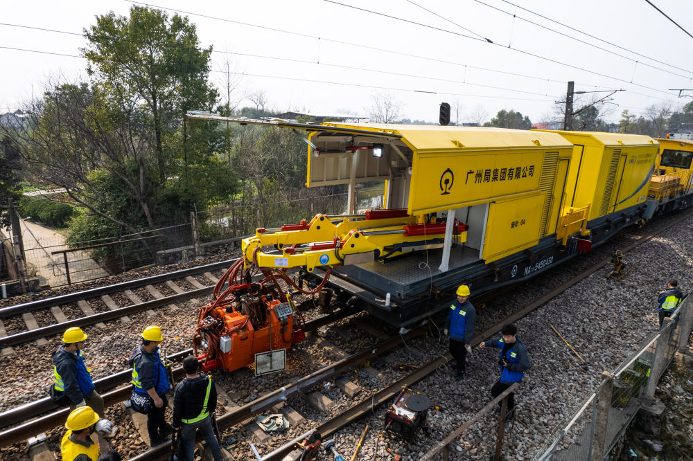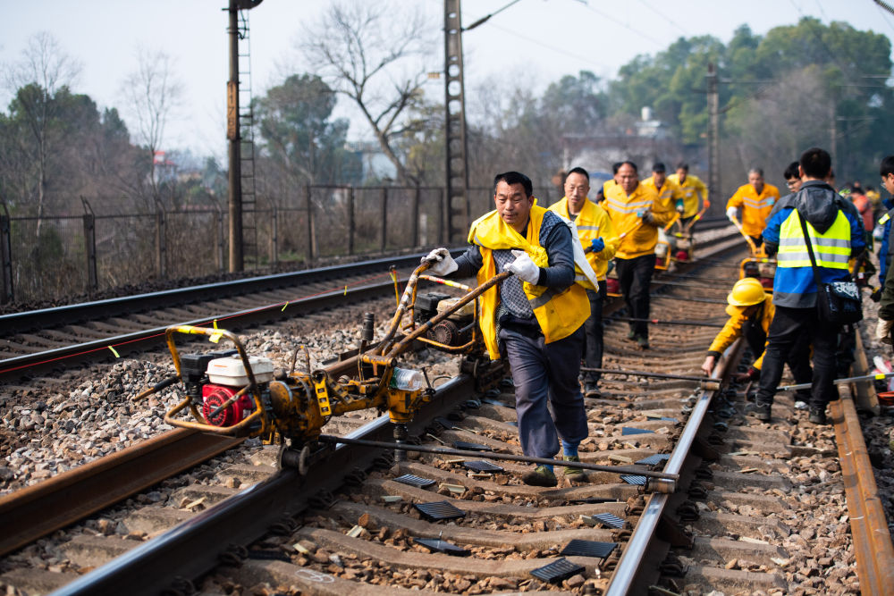 2月19日,在沪昆铁路娄底至湘潭东区间,工人在移动螺栓松紧机。