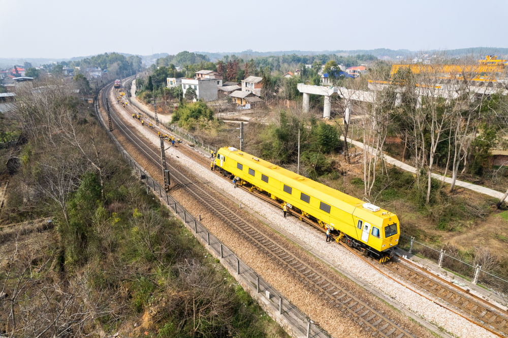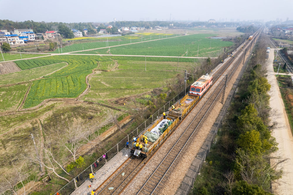 2月19日,在沪昆铁路娄底至湘潭东区间,一辆换轨作业车在施工(无人机照片)。