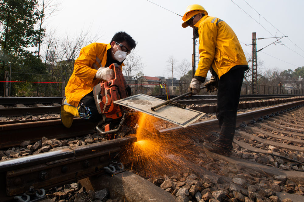 2月19日,在沪昆铁路娄底至湘潭东区间,铁路工人在锯轨。
