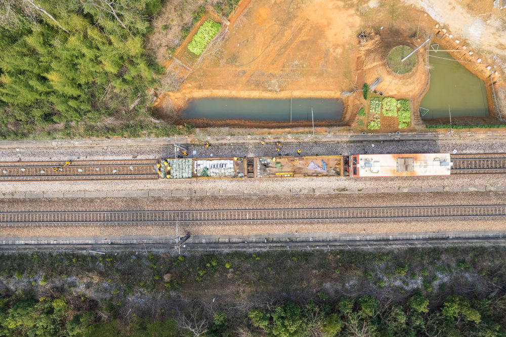 2月19日,在沪昆铁路娄底至湘潭东区间,一辆快速换轨车正在施工(无人机照片)。