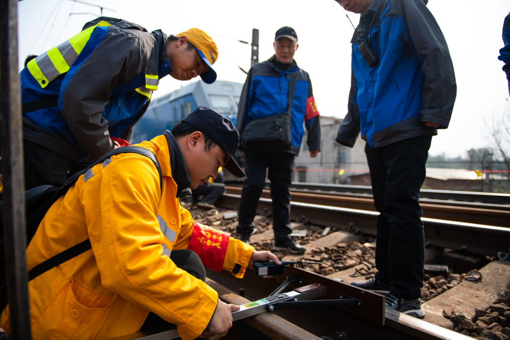 2月19日,在沪昆铁路娄底至湘潭东区间,工人使用铁路方尺给轨道定位。