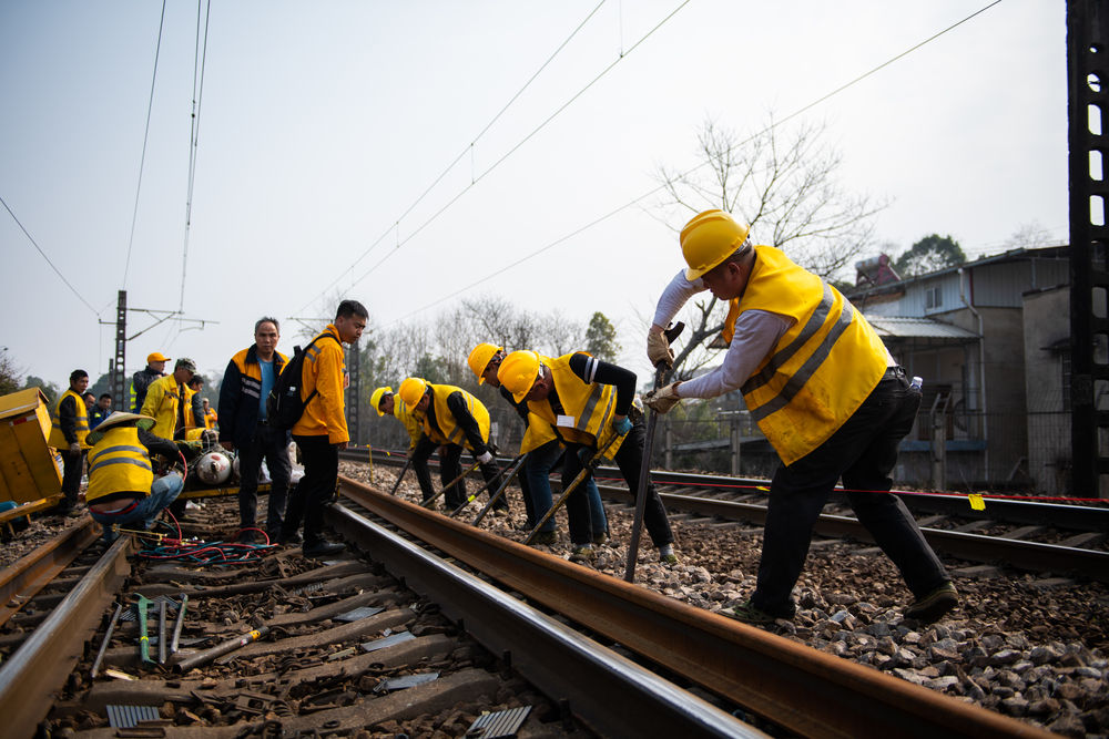 2月19日,在沪昆铁路娄底至湘潭东区间,工人在移动轨道。
