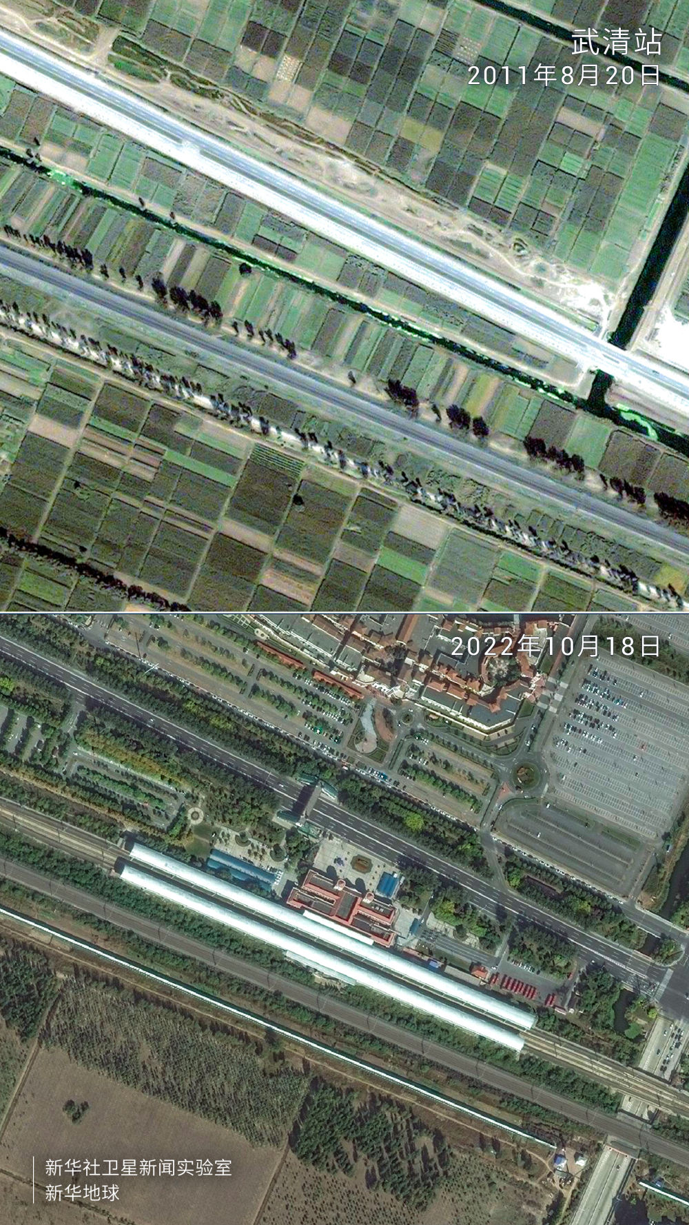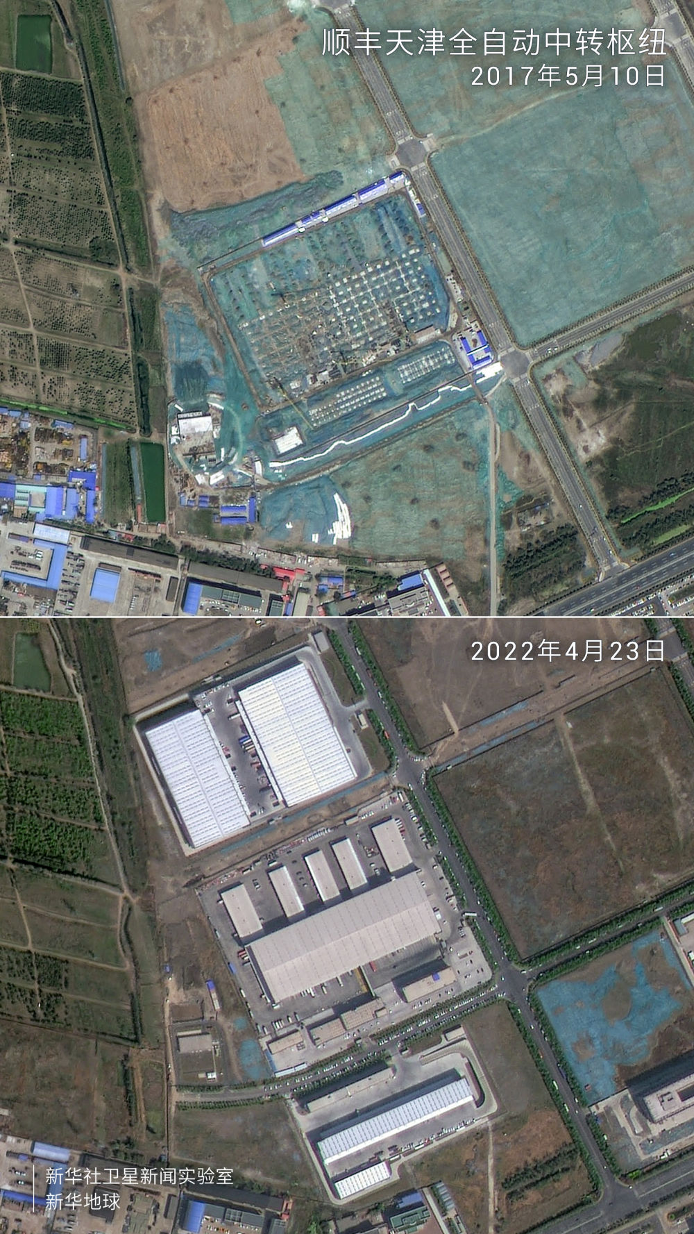 图为卫星拍摄的顺丰天津全自动中转枢纽前后对比图。