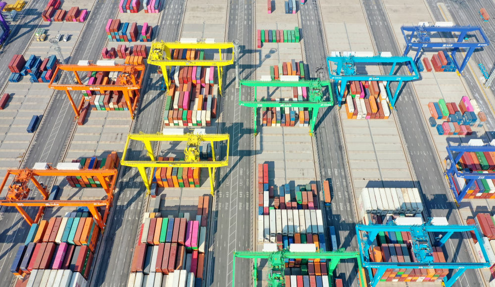 在天津港全物联网集装箱码头,场桥在堆场内吊运集装箱(无人机照片,2月21日)。新华社记者赵子硕摄
