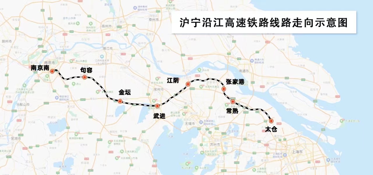 沪宁沿江高速铁路是长三角铁路网的重要组成部分,设计时速350公里,新建正线全长278.53公里,于2018年10月开工建设。线路西起南京南站,途经南京江宁区、秦淮区,镇江句容市,常州金坛、武进、经开区,无锡江阴市,苏州张家港、常熟、太仓市,终至太仓站。全线共设南京南、句容、金坛、武进、江阴、张家港、常熟、太仓8座车站,其中句容、金坛、武进、江阴为新建车站。