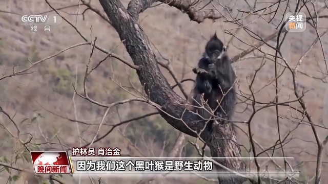 护林员 肖治金:所有的游客和这里的老百姓都喜欢投放食物,我们现在在强烈地制止。因为我们这个黑叶猴是野生动物,它所吃的食物是花果嫩枝嫩芽,不是老百姓想吃的,这些大酒大肉的这些东西,拿给它们吃。所以我们加大力度制止,不准任何人靠近我们的黑叶猴投放食物。
