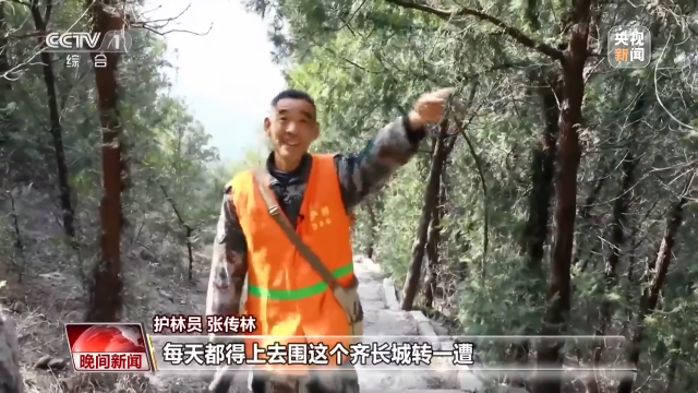 护林员 张传林:到旅游的时候,进去这个齐长城的人特别多,每天都得上去围这个齐长城转一圈。旅游的人有吸烟的,就怕扔烟蒂人走了,着了火也不知道,得天天转。