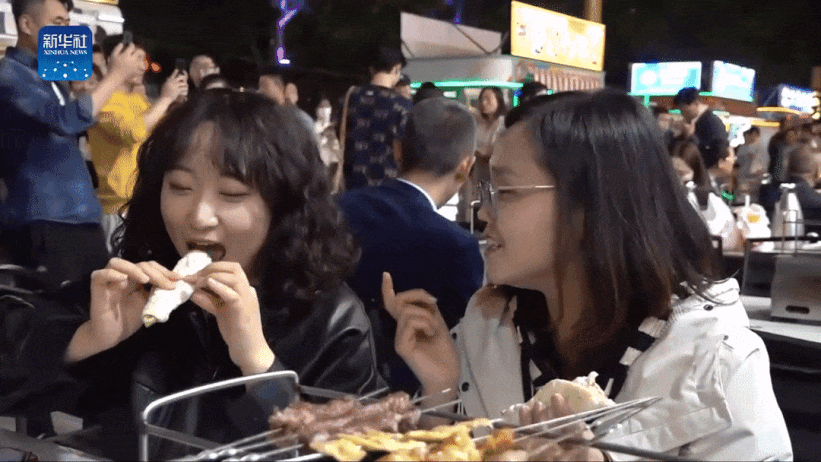 在热门打卡地,大约晚上7点,烧烤店门口排了几百米的长龙,有人带着马扎,还有人带着零食,交警在街头路口维持秩序。来自江苏的游客说:“当地朋友下午2点多就来帮忙排队了,现在终于吃上了。”不一会儿,烧烤店负责人拿起了小喇叭:“手里没菜单的别排队了,店里没肉了。”