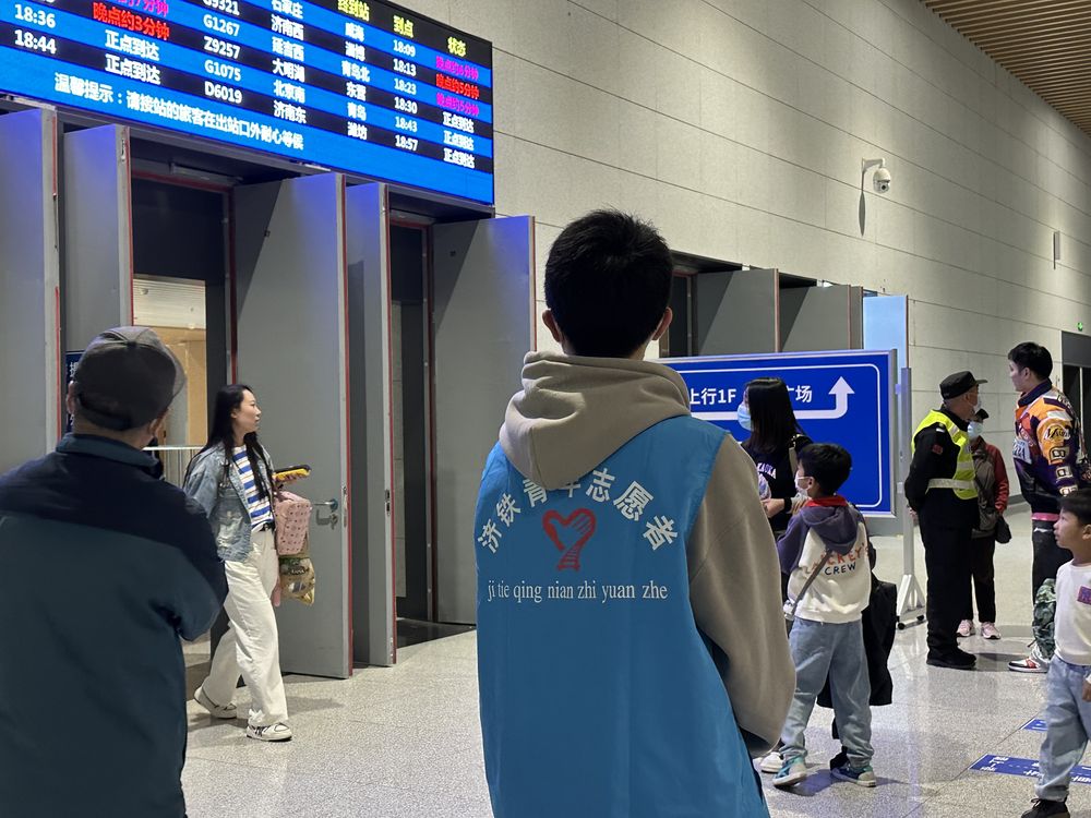 淄博火车站出站口的青年志愿者。(新华社记者 张超帆摄)