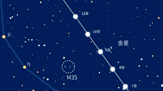 5月8日至10日,金星从M35星团附近经过,这是一次拍摄太阳系行星与深空天体相伴的好机会。M35是双子座一个大而亮的疏散星团。最适合观测的时间是9日傍晚,可同框拍摄。需要注意的是,天黑之后M35星团才会明显,可观测时长只有1小时左右。