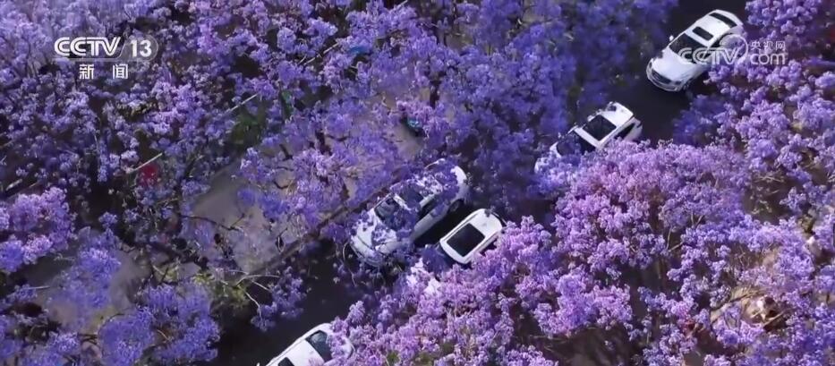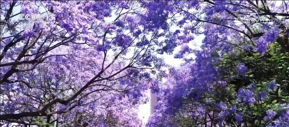总台记者 郭琳洁:我现在是在昆明的教场中路。5月上旬,道路两侧的蓝花楹竞相绽放,将这条1.4公里长的道路装扮成一条紫色长廊。
