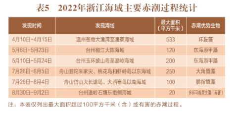 单次面积最大的赤潮是4月10日-4月15日在温州市苍南县大渔湾至渔寮海域发现的赤潮过程,最大覆盖面积为533平方千米,赤潮优势生物为环胺藻。