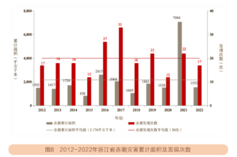 不过,2022年赤潮发现次数和累计面积均少于前10年平均值(20次、2 170平方千米),与2021年(22次,7 084平方千米)相比,赤潮发现次数和累计面积分别减少23%和78%。