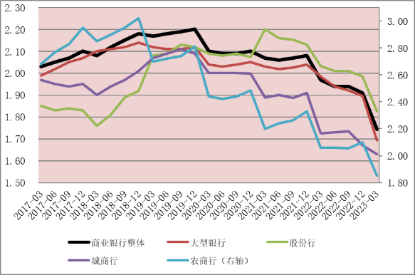 国家金融监督管理总局发布的数据显示,2022年商业银行净息差呈逐季下降之势,年末净息差为1.91%,同比下降17个基点,而2023年一季度净息差仅为1.74%,较2022年四季度下降0.17个百分点,再创历史新低。