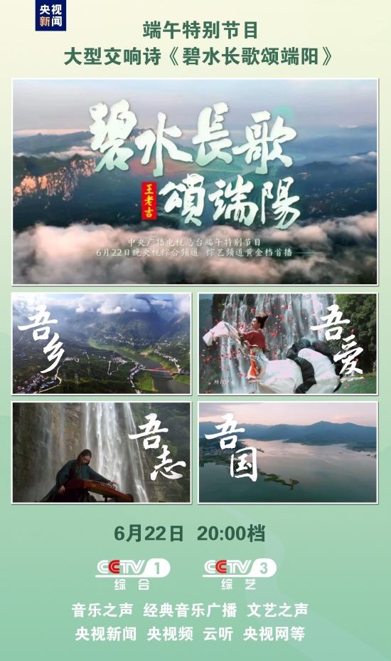 在三峡门户的绿水青山间,在轻舟飞渡的江轮之上,唱响一曲流淌在长江上的交响诗。总台端午特别节目大型交响诗《碧水长歌颂端阳》首次走出演播室,落地秀美厚重的屈原故里湖北宜昌——沉浸式实景演出以峡江两岸为天然幕布,将山水美景、人文气象与文艺表演创新融合,完成一场连接古今的对话。节目打破常规综艺晚会的模式,借用交响乐四个经典乐章方式为结构,串联“吾乡”“吾爱”“吾志”“吾国”四个篇章,用生动的文学语言和交响诗画的形式,装点祖国的秀美河山。“吾乡”篇中,诵读人李光复“以诗伴乐”诵读中国诗歌咏物名篇《九章·橘颂》节选,在对“独立不迁”“横而不流”等品行的赞颂中,表达屈原对家乡的挚爱、对故国的忠贞与深情。主题短片《乡土里的别样“离骚”》讲述了群众性文艺社团骚坛诗社的社员们创作近万首诗词的故事。在一首首诗词中,民间传承中华优秀传统文化的力量生机勃勃,强烈的文化自信和民族自豪感油然而生……节目还创造性融入国际元素,体现中华文化的创新性和包容性,彰显百花齐放、兼收并蓄的中华文明。