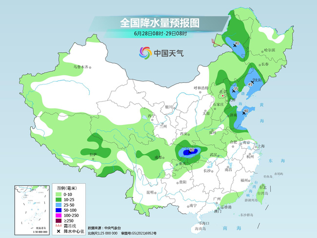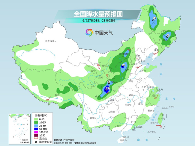 具体来看,中央气象台预计,今天,甘肃东南部、陕西、四川盆地、内蒙古中部和东北部、山西西部、黑龙江西部和东南部、吉林东北部、广东东南部等地部分地区有中到大雨,其中,山西西部、陕西西南部、四川盆地北部等地部分地区有暴雨或大暴雨(100~110毫米)。
