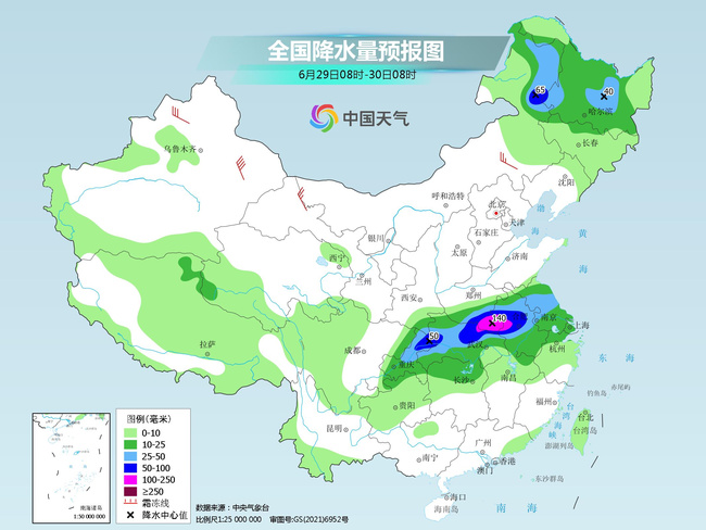 后天,内蒙古东部、黑龙江西部和中部、四川盆地东部、重庆、陕西东南部、湖北、河南南部、湖南南部、安徽、江苏等地部分地区有中到大雨,其中,内蒙古东北部、河南南部、安徽中西部、湖北北部和西部、重庆东北部等地部分地区有暴雨或大暴雨(100~140毫米)。