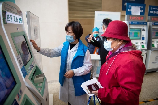 2020年12月9日,在首都医科大学附属北京天坛医院,工作人员在帮助老年人使用自助机查询号源。新华社记者 陈钟昊 摄
