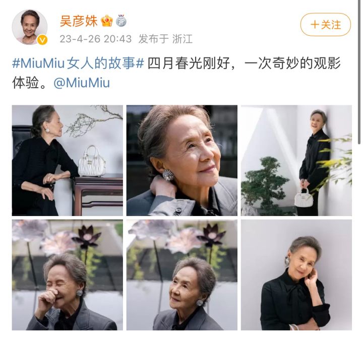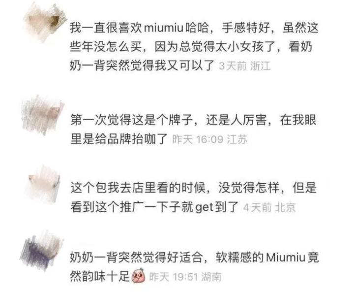 虽说奶奶的年纪并不是MiuMiu品牌的主要受众人群,但这次突破传统的合作,却成功为年轻女孩子种了草,与奶奶辈艺人合作,不失为品牌年轻化战略的反向解题思路。MiuMiu这波操作不但圈了很多粉,而且对该品牌又有了全新的认识。