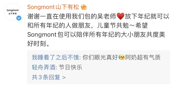此条微博是奶奶在六一当天发布的,选择这天发布,也诠释着喜欢无关年纪,Songmont山下有松就在评论回复:“谢谢一直在使用我们包的吴老师,放下年纪就可以和所有年纪的人做朋友,希望Songmont包可以陪伴所有年纪的大小朋友共度美好时刻。”网友也紧跟着在下面留言夸赞该品牌“你们眼光真好,奶奶超有气质。”