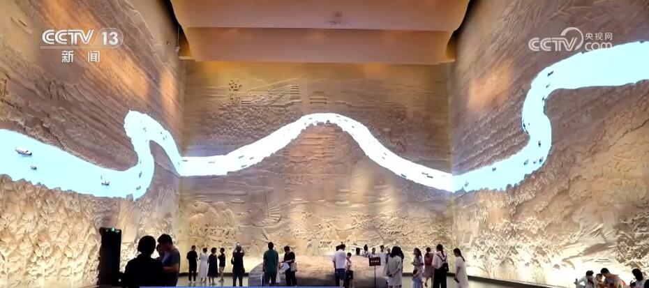 此外,不同于“文物+讲解”的传统展览形式,博物馆试图将隋唐大运河整体“搬进”展厅。在这里,游客不仅能近距离观察从古洛河河道中打捞出的“洛阳运河一号”古沉船,还能在浮雕墙前纵览大运河脉络全貌,更能走进精致复原的新潭码头,与历史“对话”。