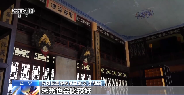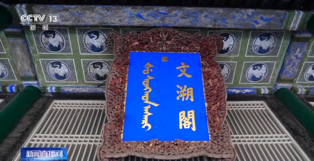 沈阳故宫博物院副馆长 于明霞:文溯阁这个牌匾是在北京做的,当时的内务府就把这个牌匾已经做出来了,建筑还没成,尺寸也不知道,做成了运到这以后发现稍稍有些大,放不下了,工匠们就想了一个比较折中的办法,应该放到二楼这个位置上的,后来把它放在了一楼。