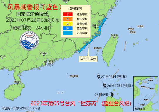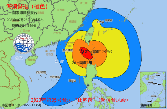 记者从自然资源部获悉,针对今年第5号台风“杜苏芮”(超强台风级),国家海洋预报台今天(26日)早上继续发布海浪橙色警报,并发布风暴潮蓝色警报。根据《海洋灾害应急预案》规定,自然资源部已于7月25日16时启动海洋灾害Ⅳ级应急响应。