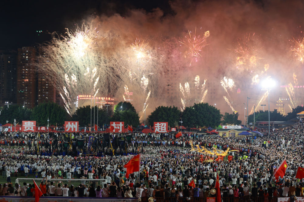 7月29日,村超结束后现场燃放的焰火表演。新华社记者 刘续 摄
