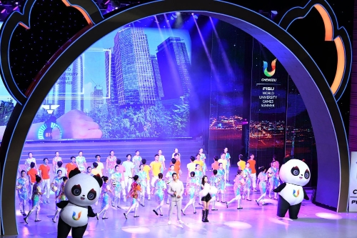 7月29日,“青春 In Time”第31届世界大学生夏季运动会运动员联欢会在成都大运村艺术中心大剧场举办。新华社记者张端摄