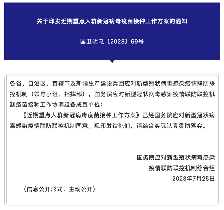 新华社北京8月1日电(记者 顾天成)疫苗接种是防控新冠病毒感染疫情的重要手段。记者1日从国家疾控局获悉,为进一步做好2023年秋冬季新冠疫情应对准备,最大程度保护人民群众生命安全和身体健康,国务院联防联控机制综合组近日印发《近期重点人群新冠病毒疫苗接种工作方案》提出,对老年人等重点人群实施针对性新冠病毒疫苗接种。