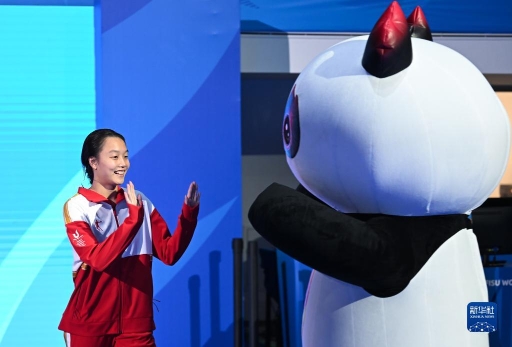 8月4日,陈佳出场时与“蓉宝”互动。新华社记者 刘坤 摄