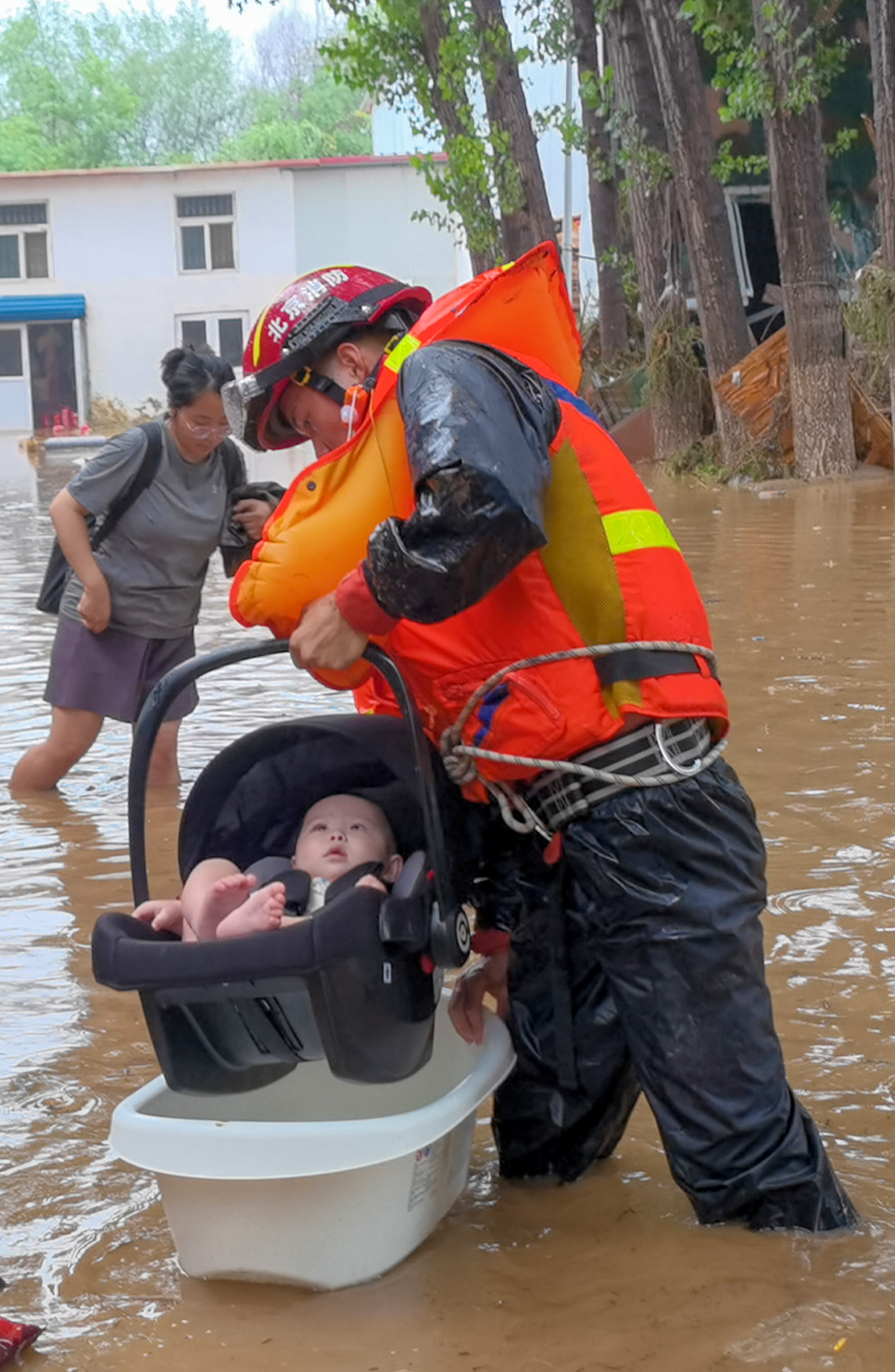 消防员携带救生衣涉水抵达